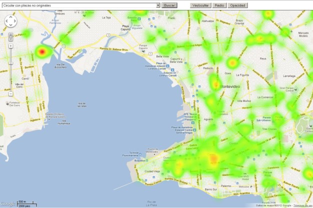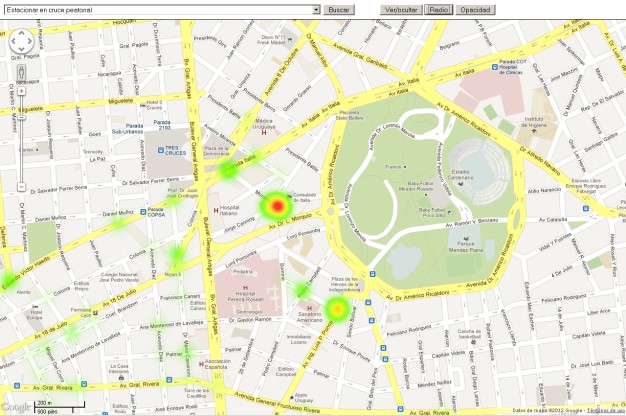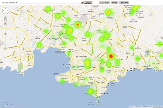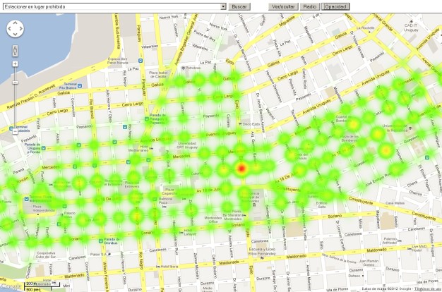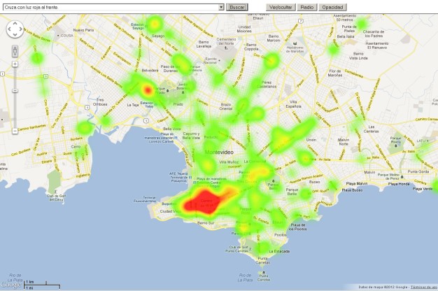 Los mapas de calor permiten de manera muy sencilla y visual conocer qué zonas de la Intendencia tienen mayor o menor densidad de multas realizadas durante 2009. Las zonas transparentes indican baja densidad de incidencias mientras que las áreas rojas y más opacas reflejan gran cantidad de infracciones.